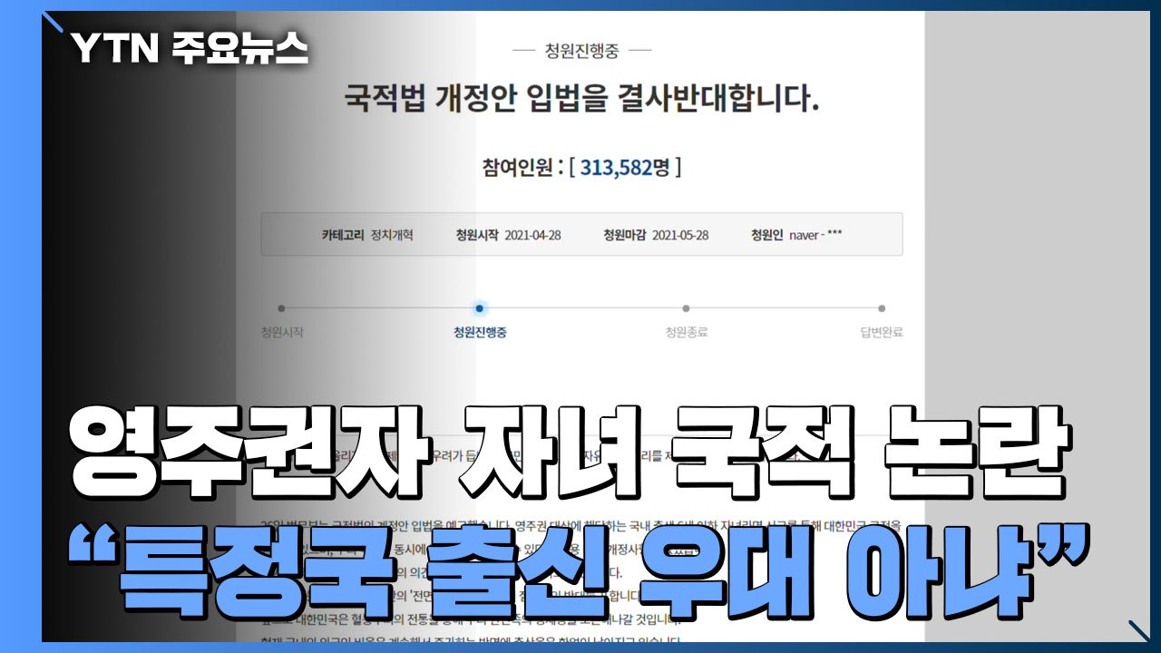 내기준 국적법 개정 공청회 제일 개소리. 지금까지 한국은 1948년 국적법 제정 이후 혈통주의 원칙을 고수하고 있다. 전문개정 2008.3.14. 제2조(출생에 의한 국적 취득) ① 다음 각 호의 어느 하나에 해당하는 자는 출생과 동시에 대한민국 국적(國籍)을 취득한다. 청와대 '국적법 개정안' 반대 청원 20만 명 육박 한국서 태어난 영주권자 자녀, 화교·재외동포 우선 대상 국내 출생 6세 이하 무조건·7세 이상 5년 이상 거주해야 법무부 저출산 고령화 시대 미래 인적 자원. 일부 불필요한 권한 삭제 3.