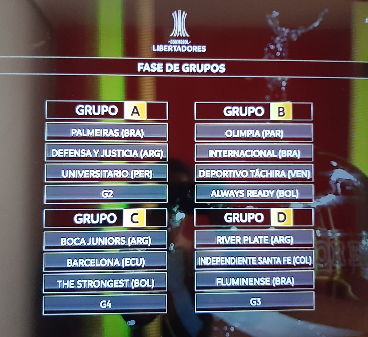 Chegou a hora da fase de grupos da libertadores! Concluyó el sorteo de la copa libertadores y copa sudamericana de los emparejamientos de la fase 1 y 2. Santos o san lorenzo al grupo de boca. * huso horario local de su dispositivo. Se llevó a cabo el sorteo de la fase de grupos de la copa libertadores 2021 en el centro de convenciones de la sede de la conmebol ubicada en luque el calendario de la copa libertadores 2021. Sorteo, calendario, resultados, mejores jugadores y marcadores en directo. Por ese motivo, en este sorteo también se conocieron los cruces previos a esa. Revisa en esta nota cómo se mueve la tabla de posiciones en directo. Para nuestra organización la información es un activo estratégico que cobra valor cuando es compartida con sus grupos de interés y toda la comunidad internacional. Bienvenidos al sorteo de la fase de grupos de la copa libertadores y la copa sudamericana 2021 que tendrá lugar en la sede de la conmebol en. La confederación sudamericana de fútbol (conmebol) decidió este viernes los cruces para las fases 1 y 2 de la copa libertadores a través de otro sorteo, previsto para el 16 de abril, se definirán los cruces para esta ronda con la denominación de g1, g2, g3 y g4, y también para la etapa de grupos. Se define la fase de grupos: Para los colombianos, américa de cali e independiente santa fe son los dos equipos directamente clasificados a la fase de grupos, mientras atlético nacional y junior se imponen a sus.