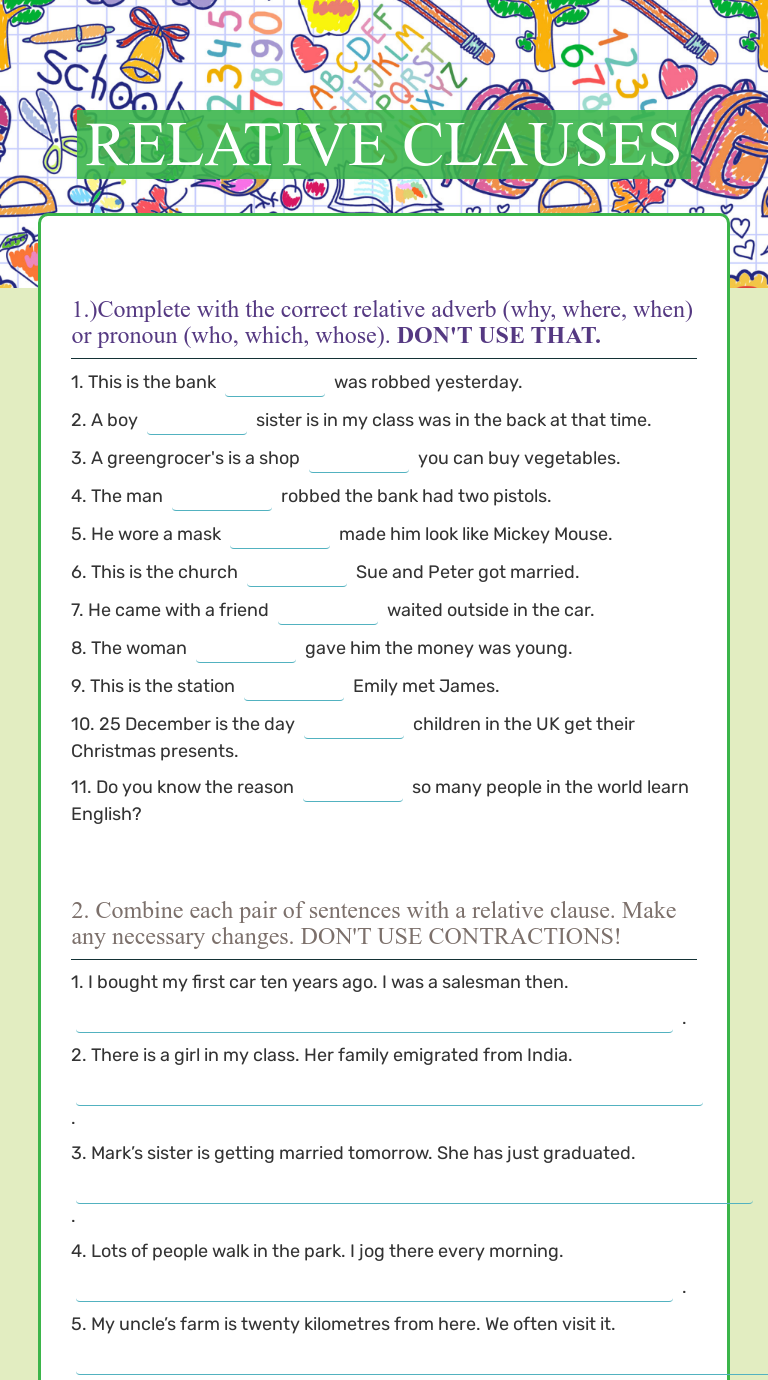 Defining these are my friends who i spend a lot of time with. There are two kinds of relative clauses: Exercises and tests on relative clauses. We can use relative clauses to combine clauses without repeating information. Idiomas now center / nichiboku.
